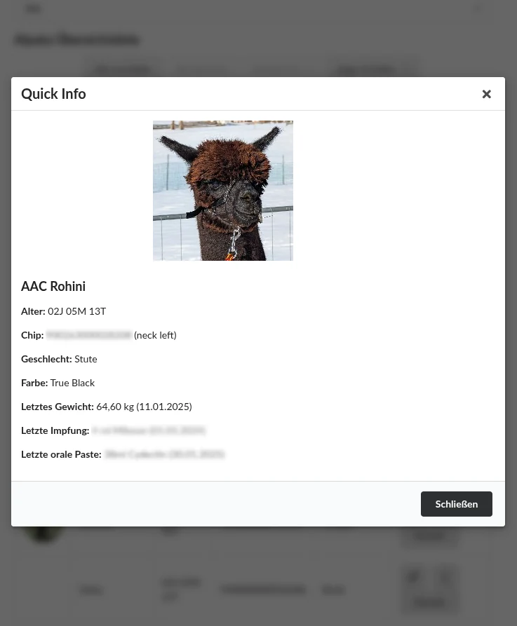 With our integrated weight tracking feature, you get a clear view of your alpaca’s long-term health at a glance! This powerful tool offers more than just numbers – it connects weight trends with key life events, helping you spot potential health developments early and take action in time.